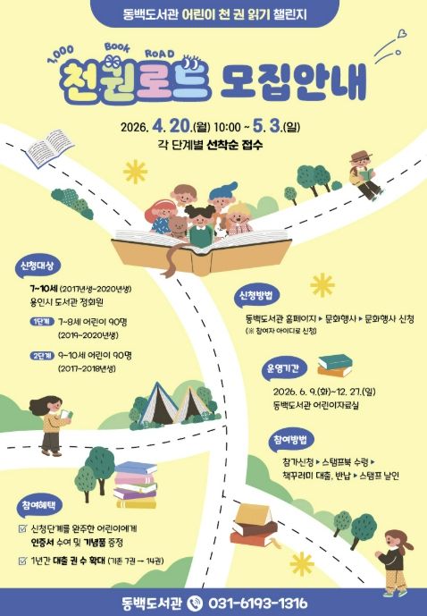 (포탈뉴스통신) 용인특례시 동백도서관은 어린이 천 권 읽기 챌린지 ‘천권로드(ROAD)’ 참여자를 모집한다고 20일 밝혔다.