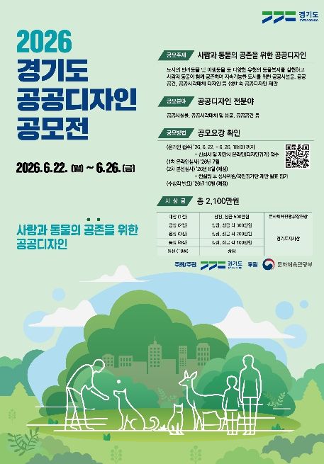 (포탈뉴스통신) 경기도가 ‘사람과 동물의 공존을 위한 공공디자인’이란 주제로 제20회 ‘2026년 경기도 공공디자인 공모전’을 6월 22일부터 26일까지 개최한다.