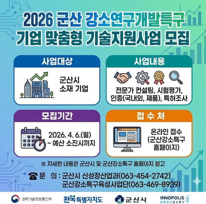 (포탈뉴스통신) 군산시는 관내 기업의 기술 경쟁력 강화를 위해 ‘2026년 군산 강소연구개발특구 기업 성장단계별 기술지원사업’을 본격 추진한다고 밝혔다.
