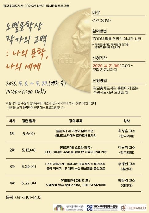 (포탈뉴스통신) 수원시 광교홍재도서관이 한국외국어대학교와 협력해 진행하는 2026년 세계문화기행 시리즈 1편 ‘노벨문학상 작가의 고백 : 나의 문학, 나의 세계’ 강좌를 수강할 시민을 모집한다.