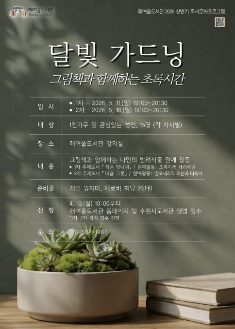 (포탈뉴스통신) 수원시 매여울도서관이 그림책 읽기와 식물 가드닝을 결합한 체험형 프로그램 ‘달빛 가드닝, 그림책과 함께하는 초록시간’을 운영한다.