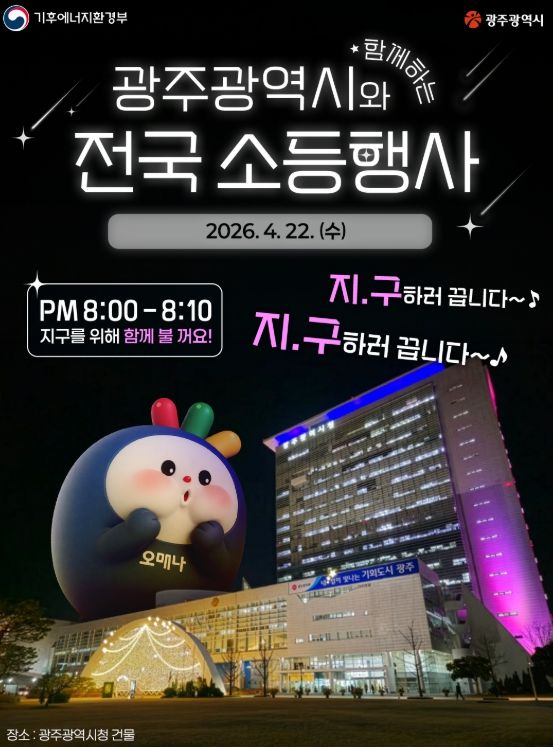특히 광주시는 ‘지구를 위해 함께 불 꺼요! 지.구하러(지구 구하러) 끕니다’ 메시지를 전달하며, 공공기관뿐만 아니라 일반가정, 아파트, 상가 등에서도 자발적으로 참여할 수 있도록 에너지 절약 실천 분위기를 조성할 계획이다.