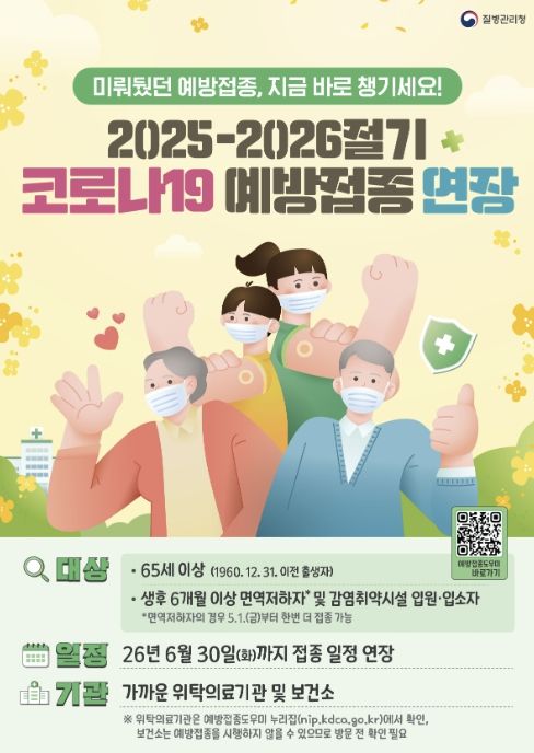 이번 연장 대상은 2025-2026절기 코로나19 미접종자와 기접종자 중 면역저하자다. 특히 면역저하자는 일반인보다 면역 유지 기간이 상대적으로 짧은 점을 고려해 최소 접종 간격 90일을 준수하면 연장 기간인 5월 1일부터 6월 30일까지 1회 추가접종이 가능하다.
