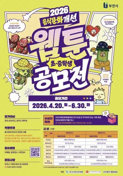(포탈뉴스통신) 부천시는 4월 20일부터 6월 30일까지 ‘2026년 음식문화개선 초중학생 웹툰·캐릭터 공모전’을 연다. 이번 공모전은 학생들이 일상 속 음식문화를 주제로 직접 창작에 참여함으로써 올바른 식문화에 대한 인식을 높이기 위해 매년 추진되고 있다.