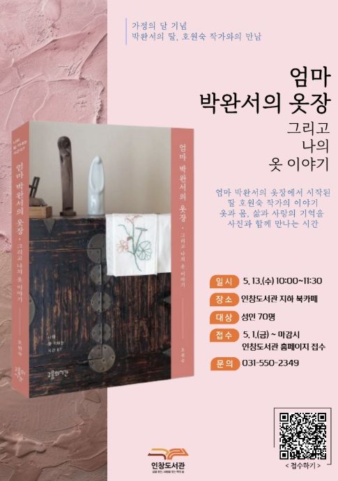 (포탈뉴스통신) 구리시립도서관은 '호원숙 작가와의 만남 ‘엄마 박완서의 옷장, 그리고 나의 이야기’' 참여 신청을 오는 5월 1일부터 접수한다고 밝혔다.