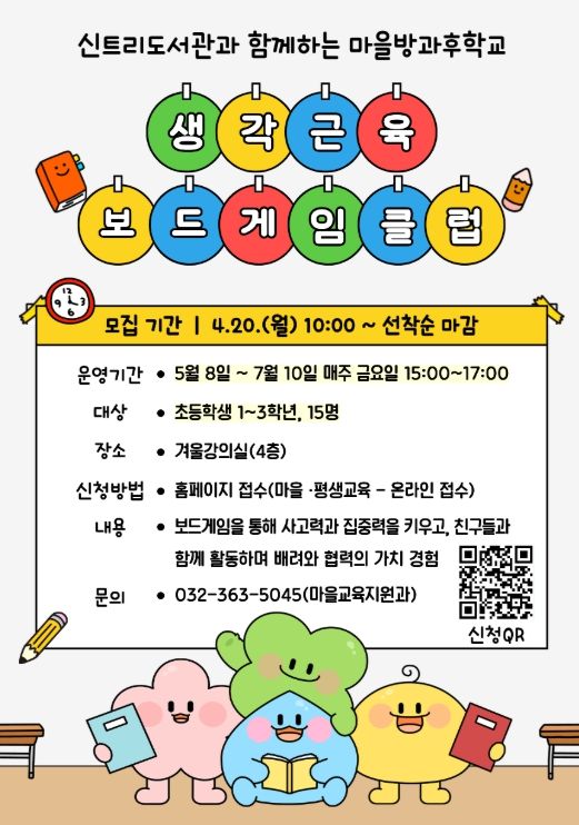 (포탈뉴스통신) 인천광역시교육청신트리도서관은 20일부터 어린이의 인지 발달과 사회성 함양을 위한 ‘생각 근육 보드게임’ 참가자를 모집한다.