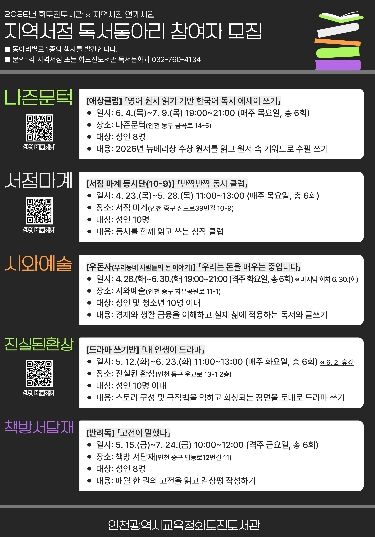 (포탈뉴스통신) 인천광역시교육청화도진도서관은 지역 독서 문화 활성화를 위해 ‘지역서점 연계 독서동아리’ 참여자를 모집한다고 20일 밝혔다.
