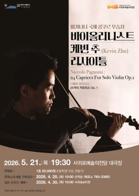 (포탈뉴스통신) 서귀포예술의전당은 세계 정상급 젊은 연주자를 소개하는 ‘2026 국제콩쿠르 위너스 콘서트 시리즈’의 첫 무대로 ‘파가니니 바이올린 콩쿠르 위너스 콘서트’를 5월 21일 저녁 7시 30분 대극장에서 개최한다.