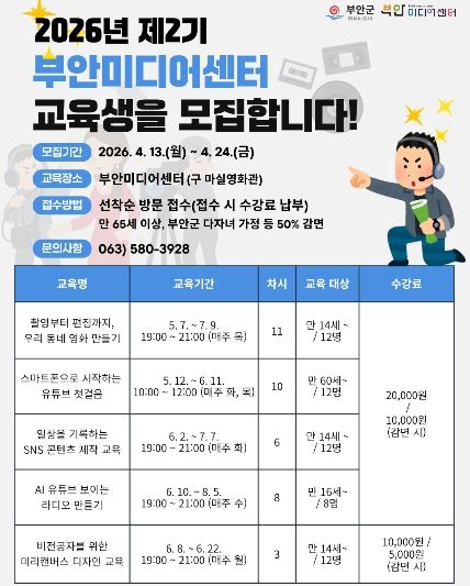 (포탈뉴스통신) 부안미디어센터는 군민의 미디어 활용 역량 강화를 위해 2026년 제2기 미디어 교육 교육생을 모집한다고 밝혔다.