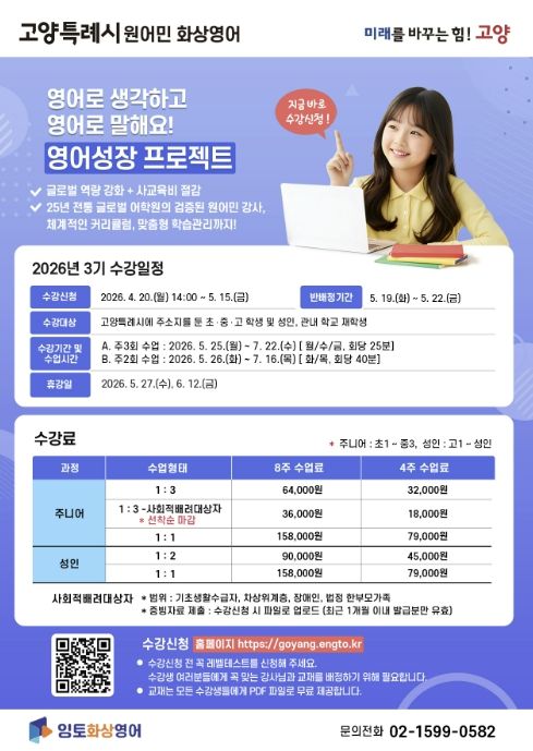 (포탈뉴스통신) 고양특례시는 글로벌 역량 강화와 사교육비 부담 완화를 위한 ‘원어민 화상영어’ 프로그램의 3기 수강생을 4월 20일부터 5월 15일까지 모집한다.