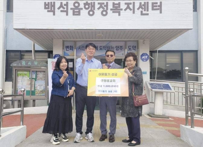 (포탈뉴스통신) 양주시 백석읍은 지난 17일 생명샘교회가 지역 내 어려운 이웃을 돕기 위한 성금 100만 원을 기탁했다고 밝혔다.