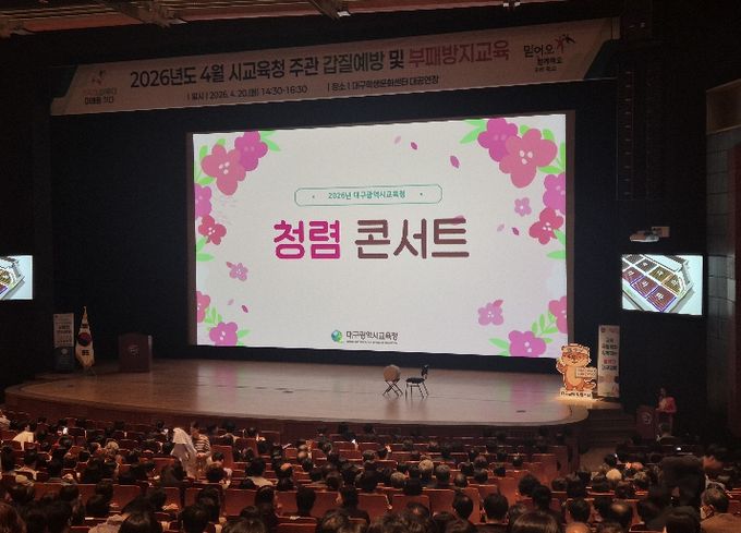 (포탈뉴스통신) 대구시교육청은 4월 20일 오후 2시 30분부터 대구학생문화센터 대공연장에서 교직원 및 관리자 등을 대상으로 ‘청렴콘서트’를 개최했다.