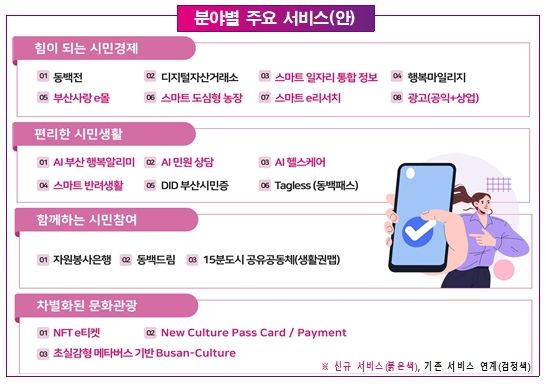 주요 서비스로는 ▲개인별 맞춤형 혜택을 알려주는 ‘인공지능(AI) 부산행복알리미’ ▲생성형 인공지능(AI) 기반의 ‘인공지능(AI)민원상담’ ▲개인 건강관리 ‘인공지능(AI) 헬스케어’ ▲‘스마트 일자리 통합 정보’ ▲‘스마트 반려생활’ ▲‘부산사랑e몰’ 등 디지털 지갑 기능을 포함한 20여 개 서비스를 하나의 앱에서 제공한다.