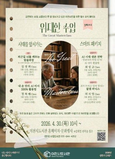 (포탈뉴스통신) 이천시립도서관은 오는 4월 30일부터 2026년 상반기 시민강사 프로그램 ‘위대한 수업’의 1차 수강생을 모집한다고 밝혔다.