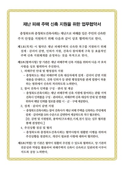 협약에 따라 도는 신속한 인·허가 등 관련 행정절차 처리를 협조하고, 충북건축사회는 설계·감리비의 최대 50% 수준 감면 및 전문 지원체계 구축 등 피해 도민은 즉각적인 기술 자문과 설계를 지원받을 수 있는 체계를 운영한다.