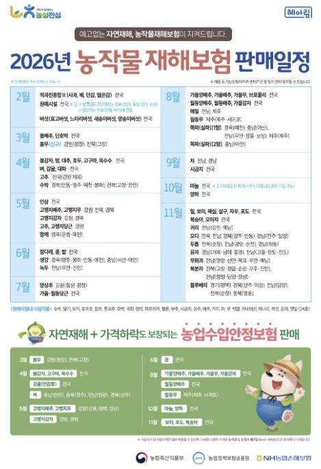 시 관계자는 “최근 태풍, 가뭄, 폭설 등 자연재해로 인한 농작물 피해가 반복되고 있는 만큼 안정적인 영농활동을 위해 농작물재해보험 가입이 중요하다”라며 “대상 농가에서는 기한 내 반드시 신청해 달라”라고 당부했다.