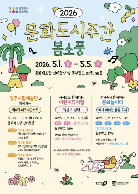 청주시와 청주시문화산업진흥재단은 오는 5월 1일부터 5일까지 닷새간 문화제조창 잔디광장과 동부창고 일대에서 열리는 ‘2026 문화도시주간 ‘봄소풍’’의 프로그램별 참여자를 모집한다고 21일 밝혔다.