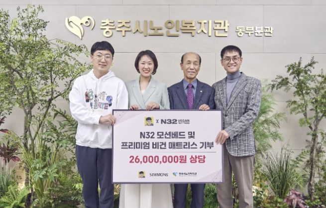 N32는 시몬스 침대의 ESG 경영 철학을 기반으로 선보인 라이프스타일 브랜드로, 이번 후원을 통해 약 2,600만 원 상당의 ‘N32 모션베드’ 2개와 ‘N32 레귤러 토퍼’ 등을 충주시노인복지관(관장 김웅)에 전달했다.