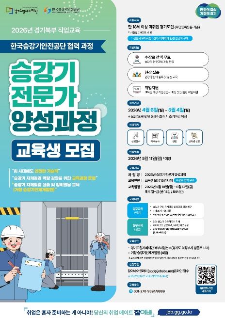 (포탈뉴스통신) 경기도일자리재단은 승강기 전문 인력 양성을 통해 일자리 문제 해결과 지역경제 활성화를 추진하고자 ‘2026년 승강기 전문가 양성 과정’ 교육생을 모집한다고 21일 밝혔다.