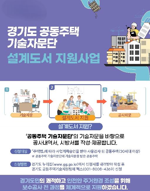 한편 이번 설계도서 지원은 경기도가 아파트의 시공부터 유지보수까지 전 과정을 책임지는 ‘생애주기별 맞춤형 종합 지원서비스’의 하나다. 공사계획 단계에서 1단계 기술자문을 먼저 받은 단지라면 누구나 이 2단계 설계도서 지원을 신청할 수 있으며, 이후 3단계인 공사 품질 확보 자문까지 하나로 이어지는 혜택을 받을 수 있다. 지원을 희망하는 아파트 단지의 입주자대표회의는 경기도 누리집에서 신청서를 내려받아 작성한 뒤 경기도 공동주택기술지원팀에 팩스로 제출하면 된다.