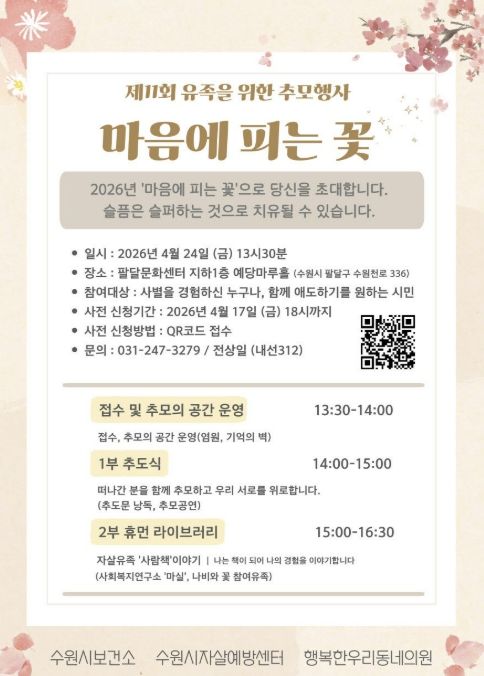 (포탈뉴스통신) 수원시자살예방센터가 24일 오후 1시 30분 팔달문화센터 예당마루홀에서 유족을 위한 추모행사 ‘제11회 마음에 피는 꽃’을 연다.