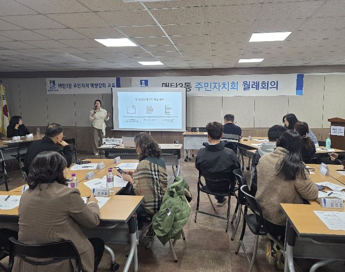 교육은 4월 20일 매탄3동을 시작으로 6월 25일 서둔동까지 순차적으로 진행한다. 동별로 전문 강사가 찾아가 참여형 교육을 운영한다. 이번 과정은 주민자치회 활동에 바로 적용할 수 있도록 실습과 분임 토의를 중심으로 구성했다.
