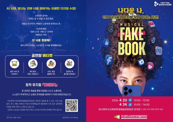 (포탈뉴스통신) 부산광역시교육청학생예술문화회관은 오는 23일과 24일 회관 대극장에서 초·중·고 학생 1,200여 명을 대상으로 ‘페이크북’ 공연을 개최한다.