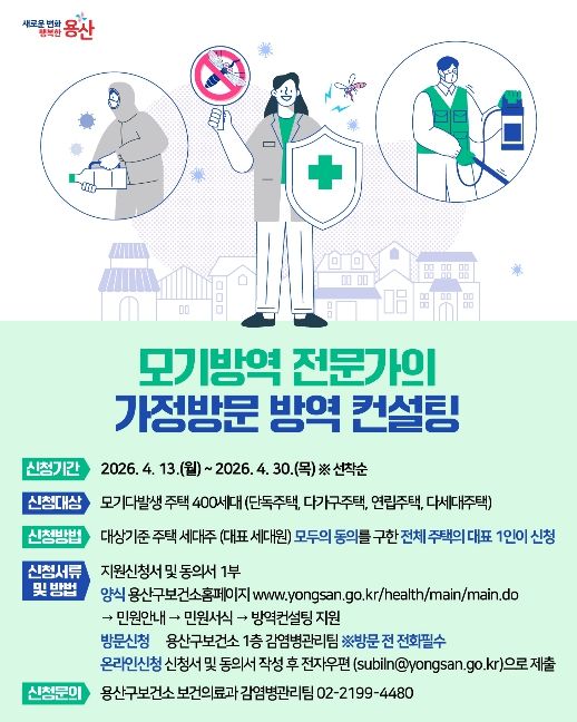 일반 신청 지원 대상은 모기 발생에 취약한 관내 단독·다가구·연립·다세대 주택 거주자다. 희망 가구는 주택 세대원의 동의를 얻은 후, 용산구 보건소에 방문하거나 담당자 전자우편으로 신청하면 된다.