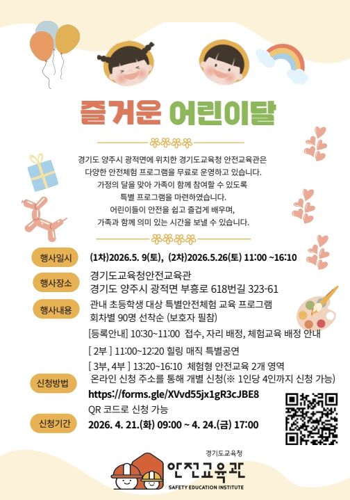 (포탈뉴스통신) 경기도교육청안전교육관이 가정의 달을 맞아 가족이 함께 참여해 안전의 중요성을 쉽고 즐겁게 배울 수 있도록 ‘가정의 달 안전교육 특별 프로그램’을 운영한다.
