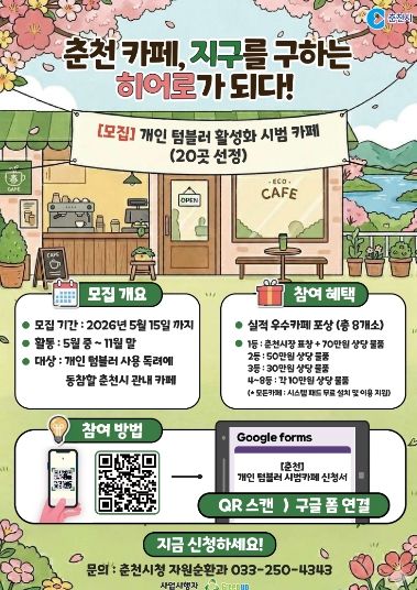 모집 기간은 5월 15일까지다. 선정된 카페는 5월 중순부터 11월 말까지 약 6개월간 시범사업에 참여하게 된다. 참여 대상은 개인 텀블러 사용 권장 등 친환경 실천에 동참할 의사가 있는 춘천시 지역 내 카페다.