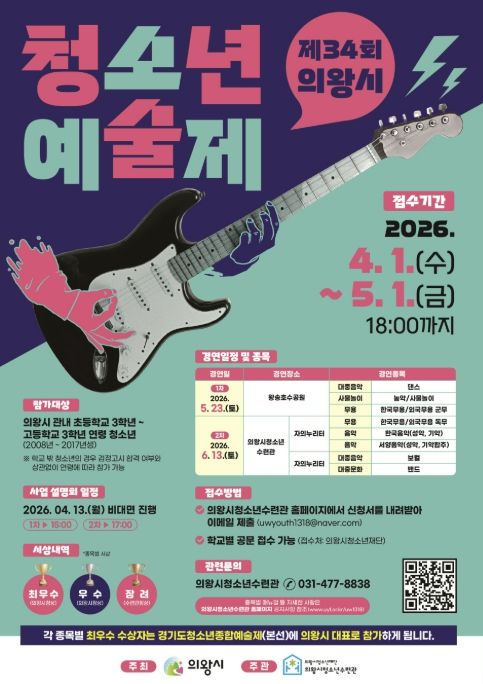 (포탈뉴스통신) 의왕시청소년재단 산하 의왕시청소년수련관은 지역 청소년의 예술적 재능과 끼 발산의 장인 ‘제34회 의왕시청소년예술제’의 참가자를 5월 1일까지 모집한다고 밝혔다.