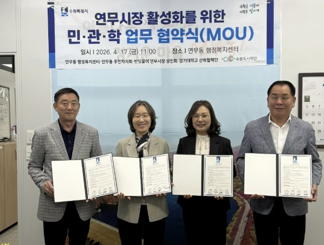 (포탈뉴스통신) 수원시 장안구 연무동 행정복지센터와 주민자치회, 반딧불이연무시장상인회, 경기대학교 산학협력단은 지난 17일, 각 기관의 긴밀한 상호 협력과 유대관계 강화를 위한 업무협약을 체결했다.