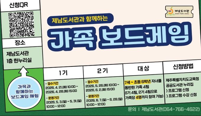 (포탈뉴스통신) 제주도교육청 제남도서관은 21일 가족이 함께하는 건전한 놀이 문화를 확산하고 도서관 이용을 활성화하기 위해 오는 5월과 6월에 걸쳐 운영되는 ‘가족 보드게임’의 참가자를 모집한다.