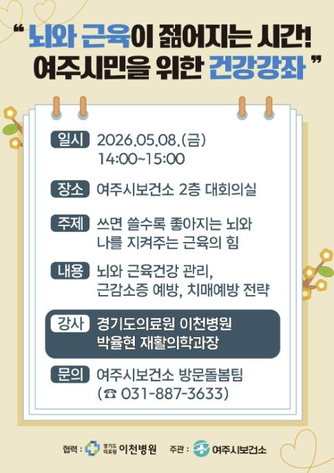 (포탈뉴스통신) 여주시보건소 건강증진과는 오는 5월 8일 오후 2시, 보건소 2층 대회의실에서 여주시민을 위한 건강강좌 '뇌와 근육이 젊어지는 시간!'을 개최한다고 밝혔다.