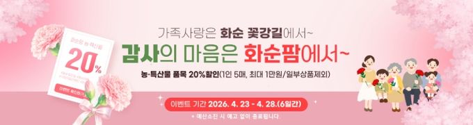 ‘감사의 마음 전달 쪽지’ 코너는 이벤트 게시판에 가족이나 스승, 소중한 이에게 전하는 감사 메시지를 작성하면, 우수 작성자 10명을 선정해 화순팜 입점 농특산물 등 2~3만 원 상당의 상품을 증정한다.