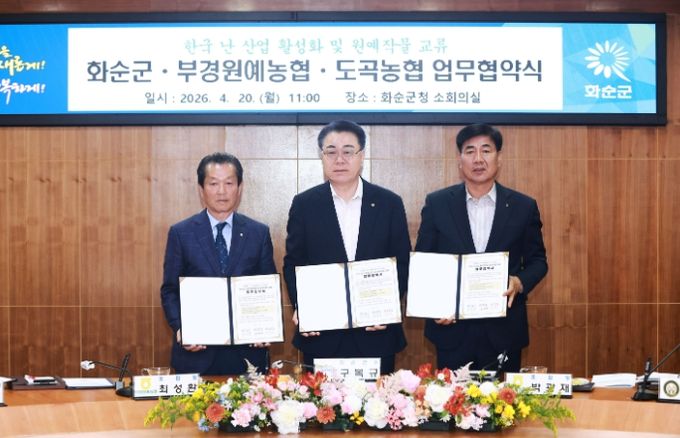 (포탈뉴스통신) 화순군은 지난 20일 부경원예농업협동조합(조합장 최성환), 도곡농업협동조합(조합장 박광재)과 함께 한국 난 산업 활성화 및 원예작물 교류를 위한 업무협약(MOU)을 체결했다고 밝혔다.