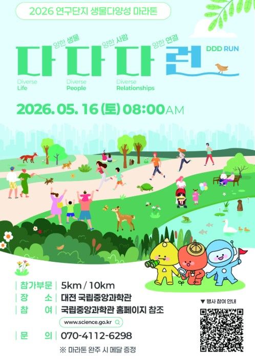 (포탈뉴스통신) 과학기술정보통신부 국립중앙과학관은 생물다양성의 소중함을 온몸으로 체감하고 일상 속 친환경 실천 문화를 확산하기 위한 2026 연구단지 생물다양성 마라톤 ‘다다다런(다양한 생물, 다양한 사람, 다양한 연결)’을 개최한다고 밝혔다.
