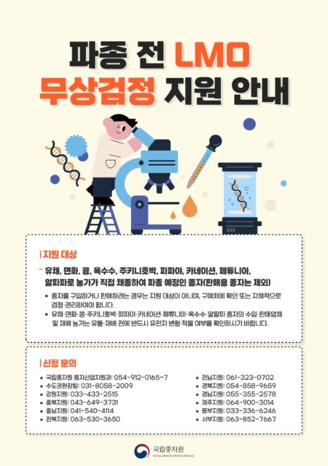 종자원 이남윤 종자산업지원과장은 “종자용 LMO가 국내 수입 승인된 적은 없으나, 유전자변형 관리작물의 유통(판매)종자와 재배지를 대상으로 지속적으로 모니터링을 실시하고 있다.”고 하면서 “이번 무상검정은 종자용으로 유통(판매)되지 않는 자가소비 형태의 종자도 파종 전 검정을 통해 비의도적인 LMO 재배를 사전 예방하는 것이 목적”이라고 말했다.