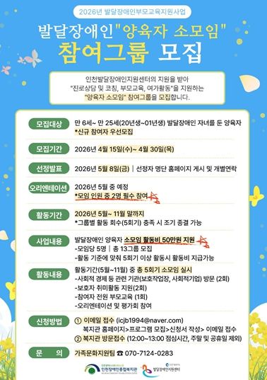 (포탈뉴스통신) 인천시사회서비스원 소속 인천장애인종합복지관은 ‘발달장애인 양육자 소모임’ 참여자를 모집한다고 21일 밝혔다.