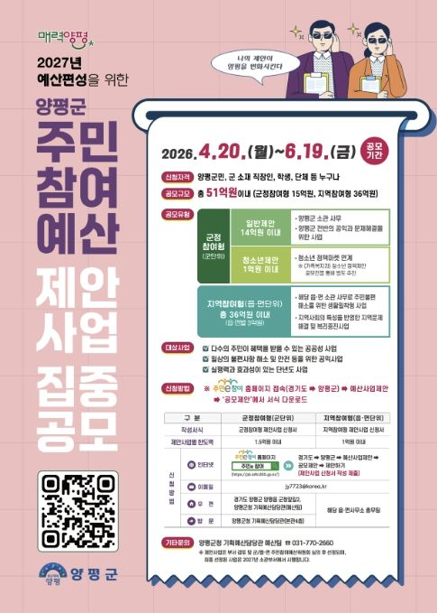 (포탈뉴스통신) 양평군은 오는 6월 19일까지 2027년 예산에 반영할 ‘주민참여예산 제안사업’을 집중 공모한다고 밝혔다.