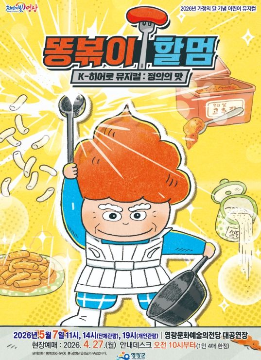 (포탈뉴스통신) 영광군은 오는 5월 7일 오전 11시(단체관람), 오후 2시(단체관람), 7시에 영광문화예술의전당 대공연장에서 가정의 달 특집공연 웃음과 감동, 그리고 건강한 메시지를 전하는 이야기 ‘어린이뮤지컬 똥볶이 할멈’을 공연한다.