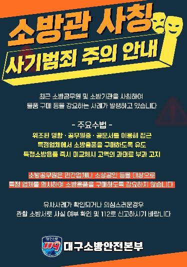 대구소방안전본부는 소방기관 명의의 구매·계약을 빙자한 연락을 받을 경우 즉시 응하지 말고, 반드시 해당 기관의 공식 대표번호를 통해 사실 여부를 확인해야 한다고 강조했다.