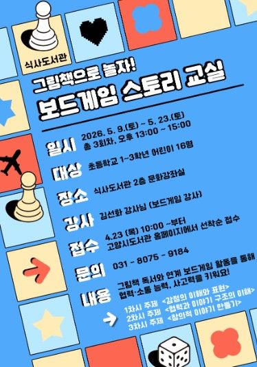 (포탈뉴스통신) 고양특례시 식사도서관이 오는 5월 9일부터 공공도서관 독서문화 프로그램 ‘그림책으로 놀자! 보드게임 스토리 교실’을 운영한다.
