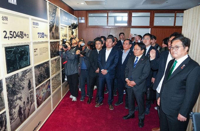 우원식 의장과 강기정 시장은 도청 본관 → 도경찰국 본관 → 상무관 순으로 50분가량 관람했다. 특히 경찰국 주제영상실과 상무관에서 항쟁 과정 및 희생자 시신 수습 과정을 주제로 한 영상을 시청하며 민주주의를 위해 희생한 이들을 기억했다. 또 도청 외벽, 도청 앞 은행나무 등에 새겨진 탄두 흔적 등을 주의 깊게 살펴봤다.