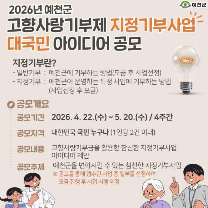 (포탈뉴스통신) 예천군은 기부자가 사업 목적에 공감하고 직접 수혜 대상을 결정하는 ‘고향사랑 지정기부제’를 적극 도입하기로 하고, 그 첫걸음으로 4월 22일부터 5월 20일까지 '2026년 예천군 고향사랑기부제 지정기부사업 아이디어 공모전'을 열어 국민들의 참신한 제안을 받는다.