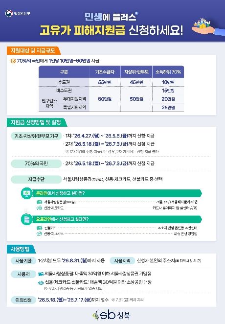 성북구 관계자는 “이번 지원금이 고유가로 어려움을 겪는 구민 부담 완화에 도움이 되길 기대한다”며 “구민이 불편 없이 신청하고 지원금을 신속하게 받을 수 있도록 준비에 최선을 다하고 있다”고 말했다.