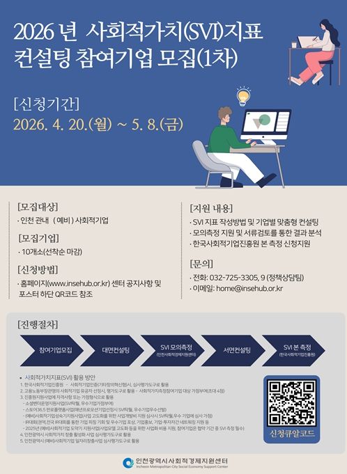 (포탈뉴스통신) 인천광역시는 관내 사회적경제기업의 지속가능한 성장과 사회적 가치 창출 역량 강화를 위해 ‘2026년 사회적가치지표(SVI) 컨설팅(1차)’ 참여기업을 모집한다고 밝혔다.