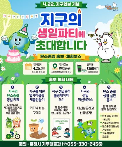 (포탈뉴스통신) 김해시는 지구의 날(4.22)을 기념한 제18회 기후변화주간을 맞아 오는 25일 오전 10시부터 오후 3시까지 연지공원에서 탄소중립 체험 행사‘지구의 생일파티에 초대합니다’를 운영한다고 22일 밝혔다.