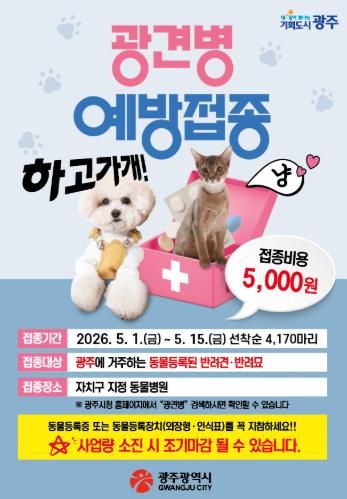 (포탈뉴스통신) 광주광역시는 반려동물과 시민의 건강을 지키기 위해 5월 1일부터 15일까지 ‘봄철 광견병 예방접종 사업’을 추진한다.