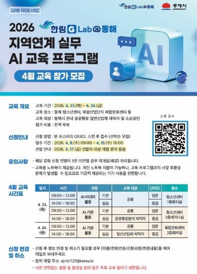 (포탈뉴스통신) 동해시와 한림대학교(총장 최양희)는 동해시 청소년센터와 북평산업단지 복합문화센터에서 공공행정 및 지역 산업체 종사자를 대상으로 직무 특성에 맞춘'한림 G-Lab@동해 지역 연계 실무형 AI 교육 프로그램'을 운영한다고 밝혔다.
